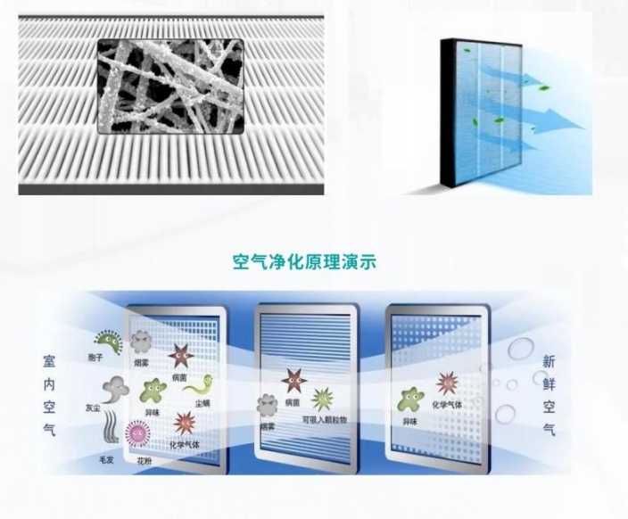 升級第三代過濾材料,由多種成分復(fù)合而成,具有凈化PM2.5、殺菌、去除甲醛、苯系物、VOC等有害氣體等功能。使用靜電紡絲生產(chǎn)納米直徑聚合物,合成基材纖維。再在基材纖維中添加活性炭、溶菌酶、光催化、活性硅...等組成。滿足《綜合醫(yī)院建筑設(shè)計規(guī)范》GB51039-2014.
